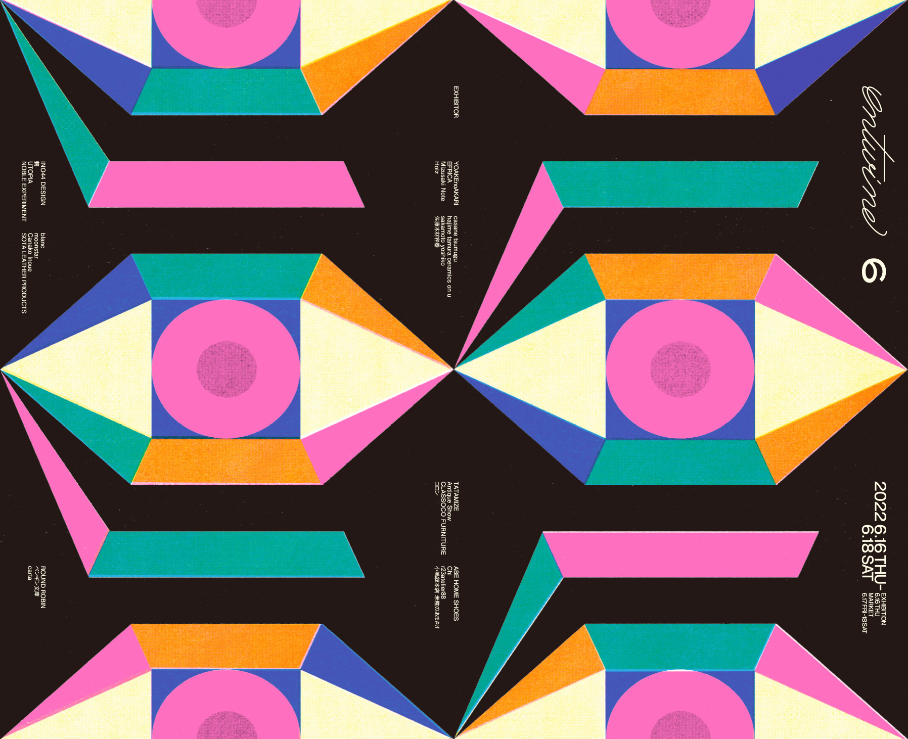 2022年6月に盛岡で行われた合同展示会『entwine 6』のポスター&フライヤー。entwineの『e』と6回目の開催、6月開催の『6』モチーフのタイポグラフィーで構成されたデザインで、さらに色も6色(背景色の黒含む)、東北6県と『6』縛りにした。また、この合同展示会のこだわりとも言える『直接会って、見る』ということにフォーカスし、人間の『目』や俯瞰から見た『人』を表現したデザインにもなっている。
