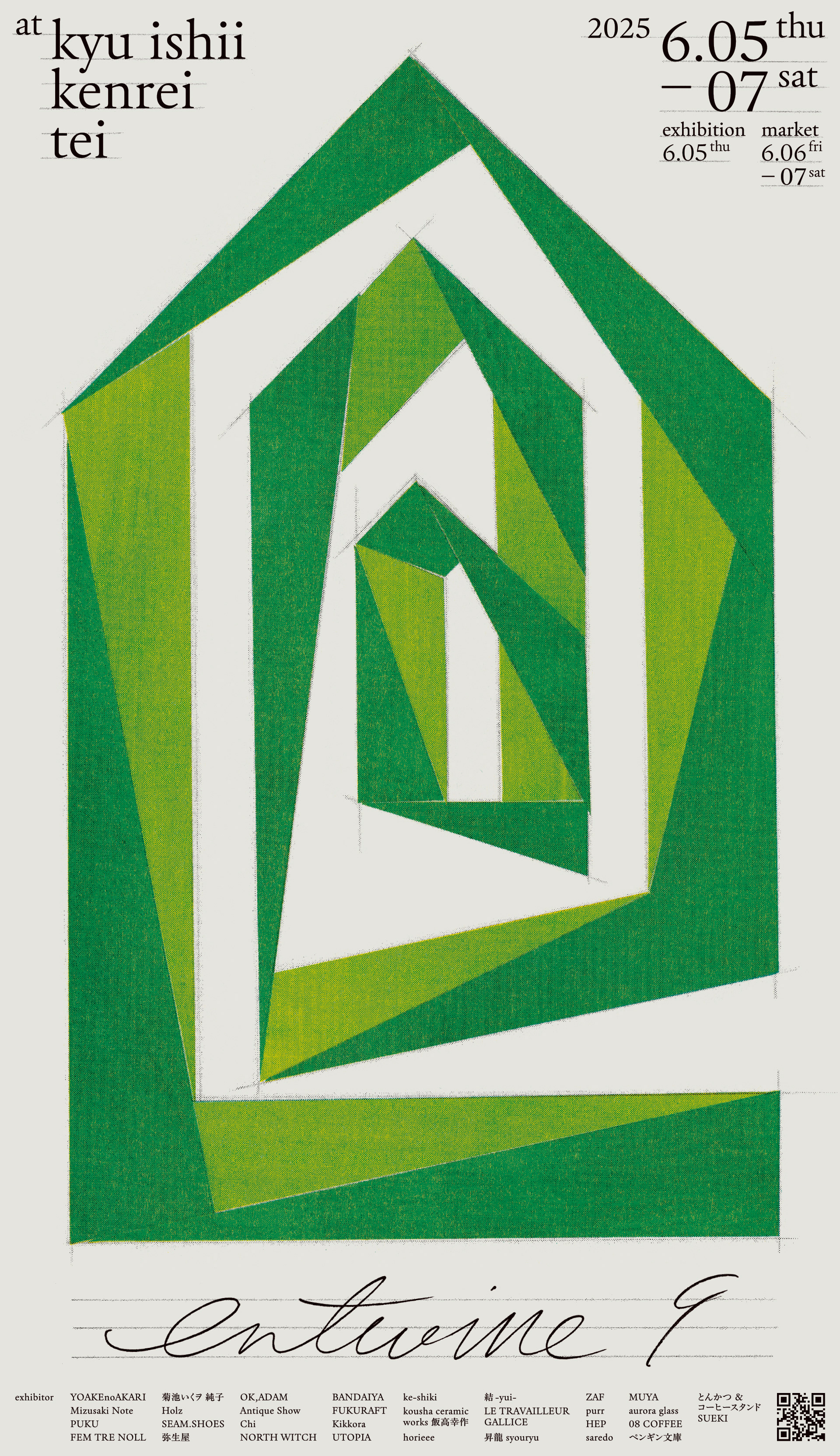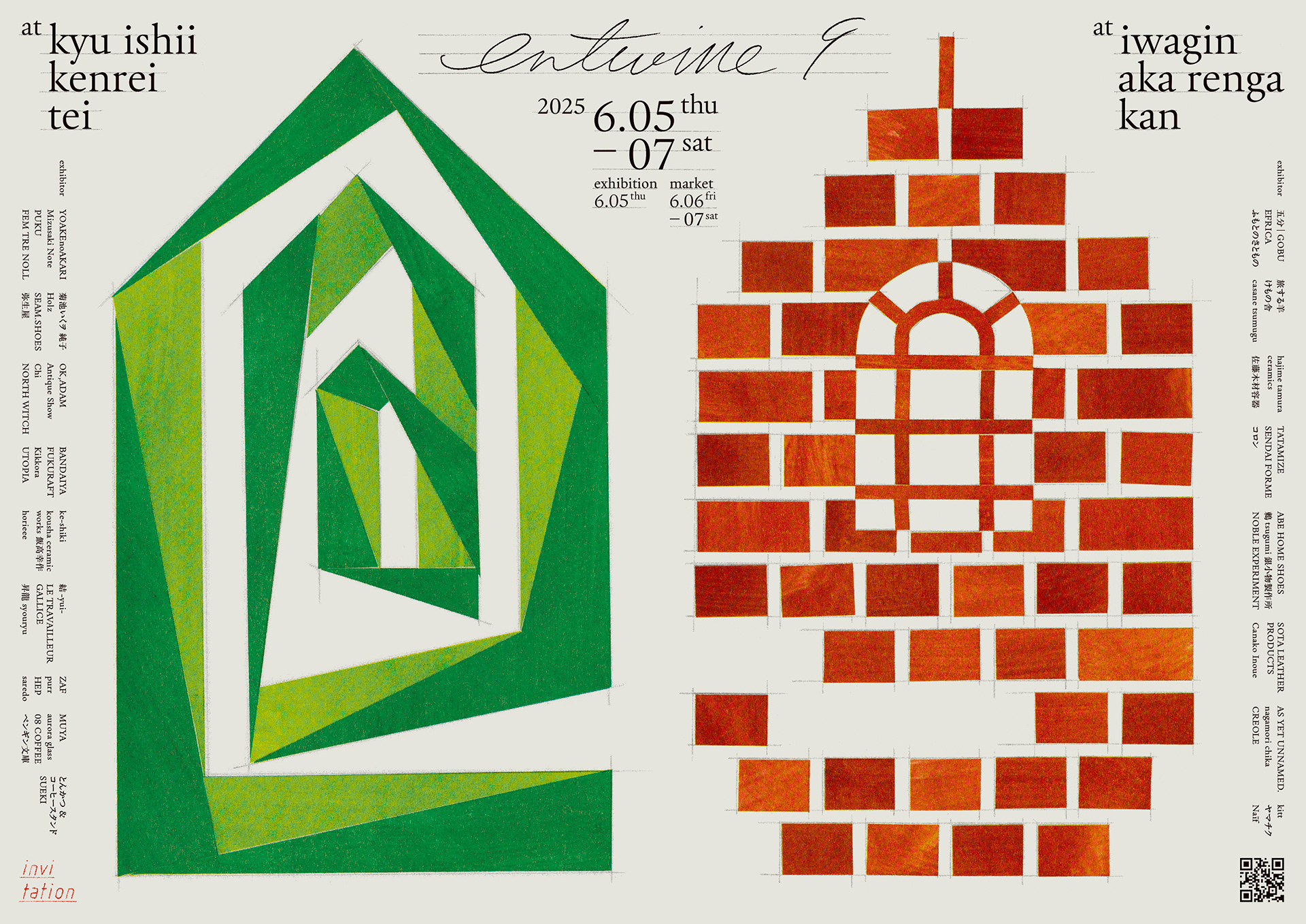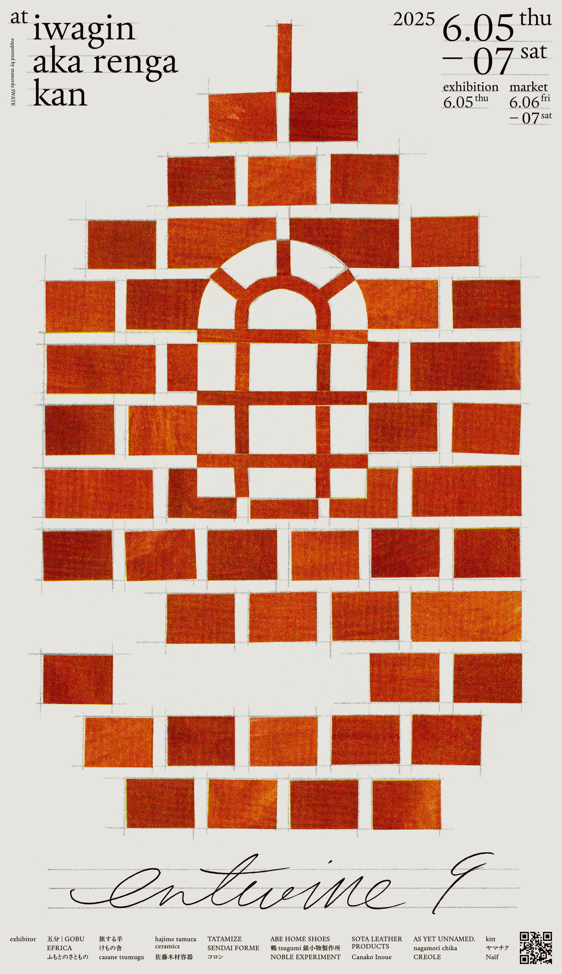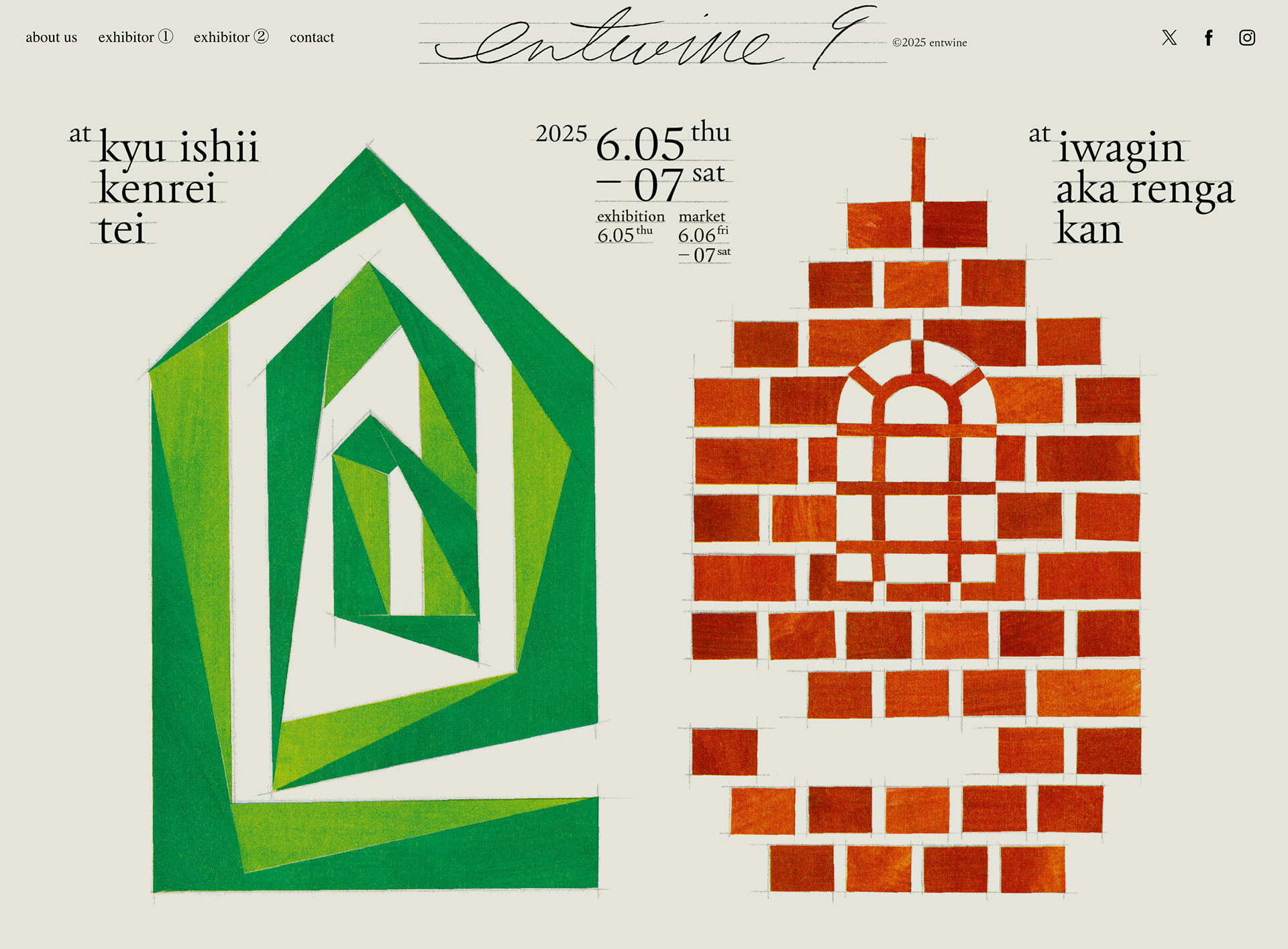 岩手県盛岡市で開催されている「衣・食・住」をテーマにした合同展示会『entwine』のポスターとフライヤーとWEBページ。今回で9回目を迎えたentwineは初の2会場開催ということで、旧石井県令邸の蔦が絡まる建物を『e』で、岩手銀行赤レンガ館を『9』で表現しています。