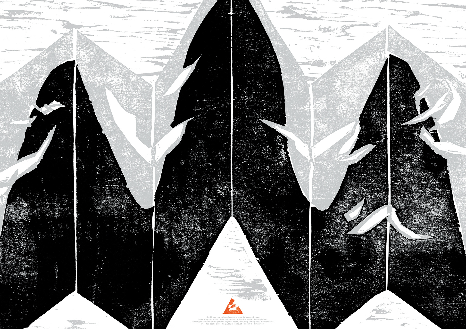 冬の山をイメージしたポスター。一見、ただの「屏風に描かれた山」に見えるかもしれませんが、実は、自然の風景の中に文字を配置しています。屏風に描かれた黒い山は、漢字の「山」になっており、山にかかる雲は、よく見るとカタカナで「ヒマラヤ」になっています。ビジュアルは、木版画の手法を用いて制作。印刷は、冬の山を表現するためシルバーインクを使用しました。