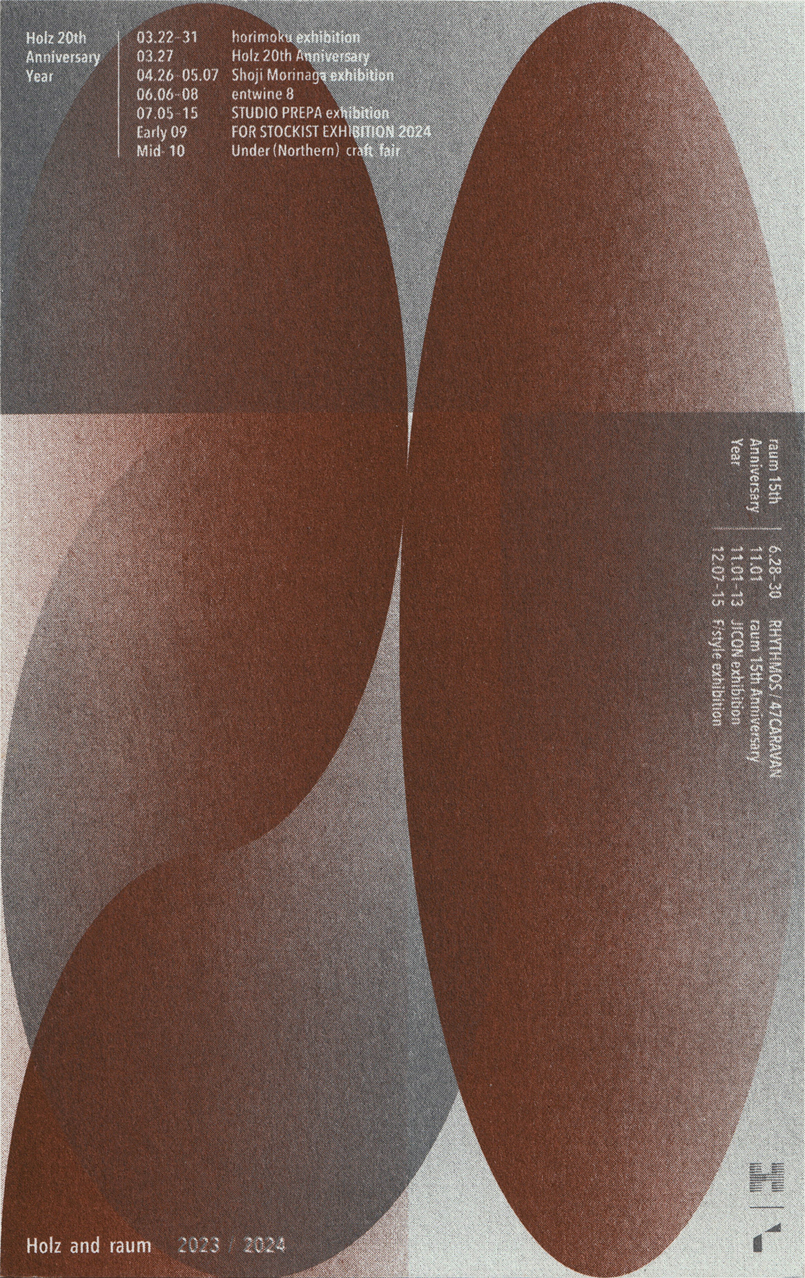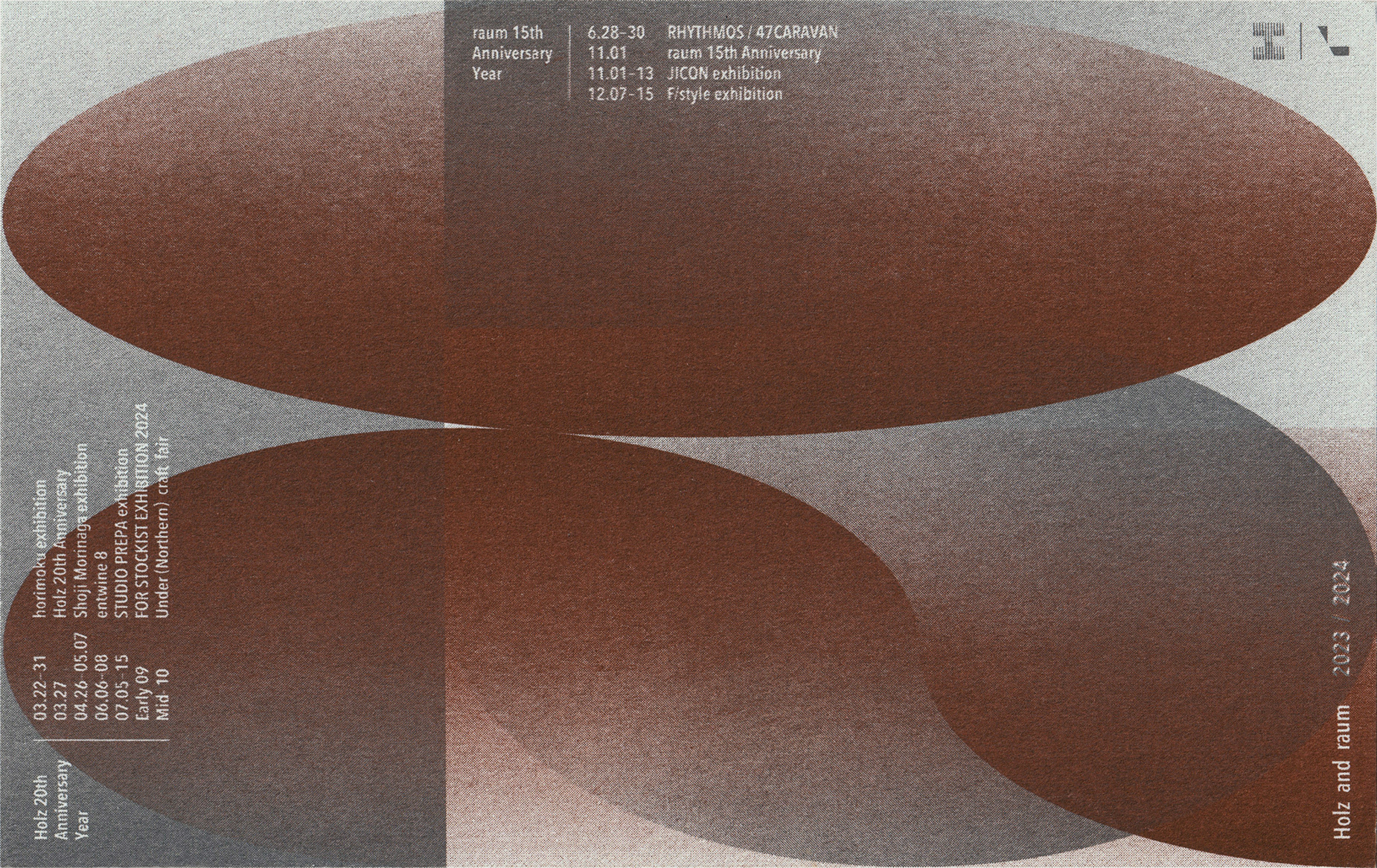 岩手県盛岡市に店を構えるHolz Furniture and interiorとraumの年末年始ご挨拶用のDM。2024年は、Holzが20周年、raumが15周年のアニバーサリーイヤー。Holzのイメージカラーである茶色、raumのイメージカラーであるグレーを使用し、20と15でタイポグラフィックに表現しました。