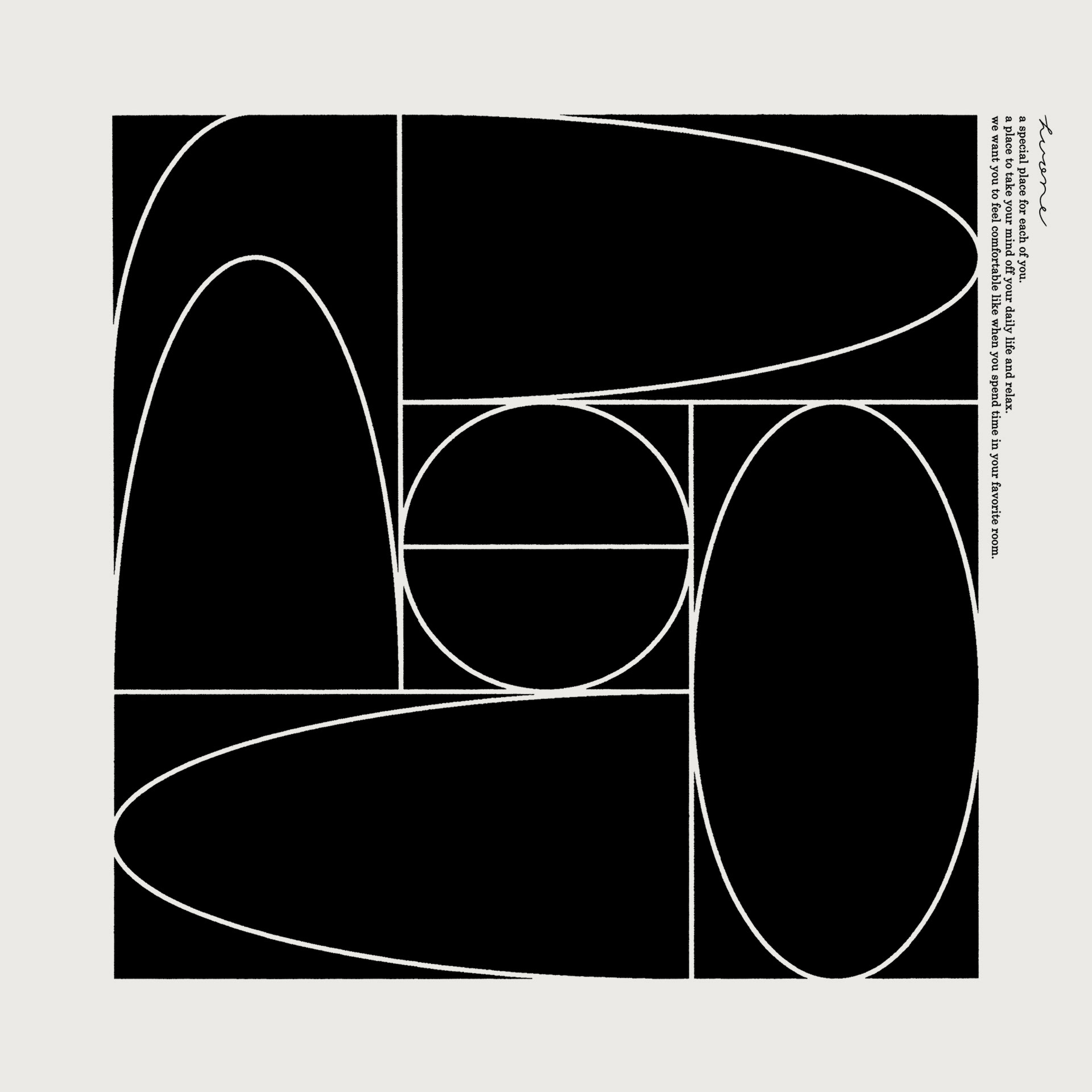 新潟市のヘアサロン『huone』の3周年ロゴとショルダーバッグ。フィンランド語で『部屋』という意味の『huone』を日本的解釈で四畳半の茶室で表現。左上から右回りに『huone』という文字を畳の形の中に収め、現代的な家紋のような見え方にしました。